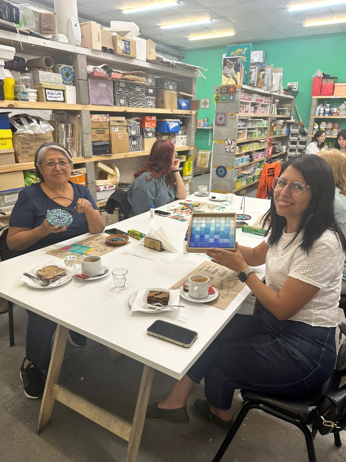“Participamos de la experiencia de Café & Mosaico y la verdad que nos encantó! El lugar es increíble, tiene de todo. Te hacen elegir entre una pieza (puede ser figuras de madera, porta sahumerios, espejos, entre otros). La merienda cumple muchísimo, el tostado y el budín muy ricos. La atención me pareció excelente, las chicas están ahí presentes dispuestas a explicarte y a responder a todas las consultas; te dejan decidir los diseños, los colores, y te ayudan en lo que necesites, creando un ambiente muy ameno y relajado. 10/10” – Florencia B